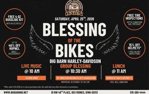 | Join us at Big Barn Harley-Davidson for a great day of bikes, community, and good times! The Barn will be offering motorcycle blessings to kick off a safe riding season, followed by lunch and exclusive in-store deals you won’t want to miss. |